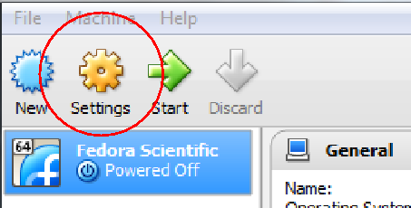 To do this, make sure that your Fedora Scientific VM is highlighted in the left panel. It should be, since it is probably the only one there.