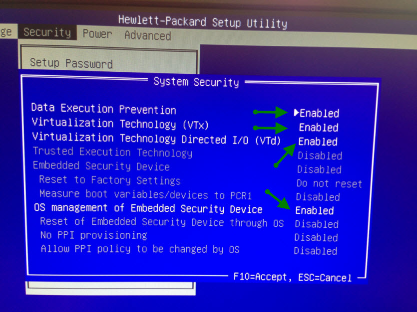 “Enable” VT-x, and VT-d if it is there.. Below is a screen shot of my BIOS page–yours may look different, but should be similar. In particular, you should be able to find the VT-x and VT-d items. If you can only find VT-x, that is fine–turn that ON (Enabled).